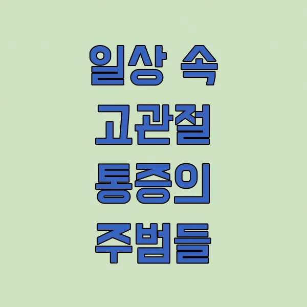 나이가 들면 누구나 겪을 수 있는 가장 흔한 원인이에요. 관절 연골이 닳아 없어지면서 뼈끼리 마찰되어 통증이 생기는 거죠. 초기에는 뻐근한 느낌 정도지만, 심해지면 걷기조차 힘들어져요 . 특히 날씨가 궂을 때 더 아프다는 분들이 많더라고요.